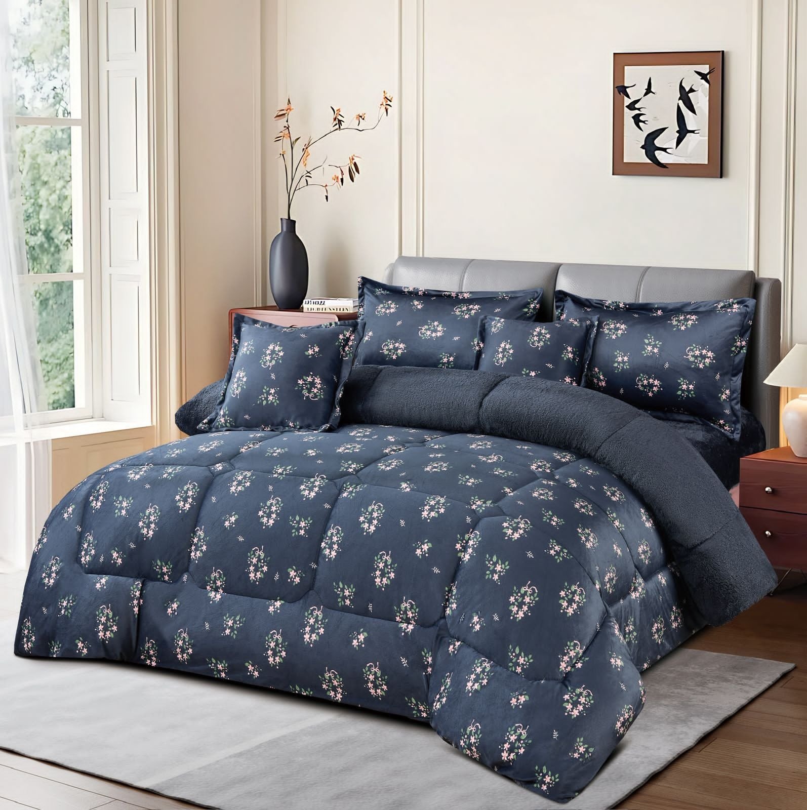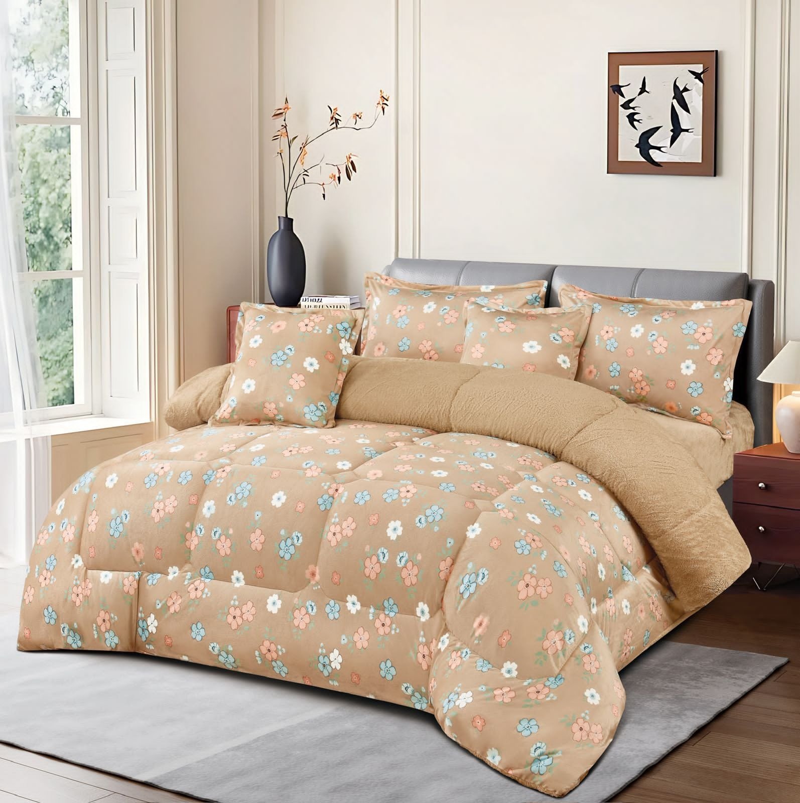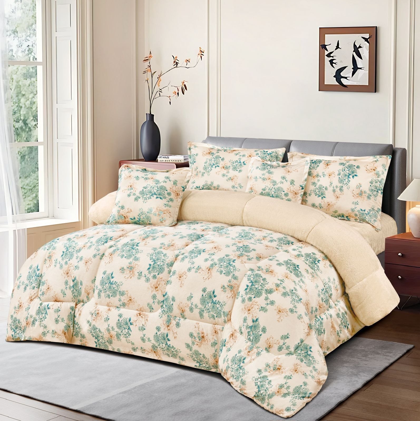 يأتي المفرش بألوان هادئة ونقشة أزهار فاخرة تجعله مناسبًا لمعظم ديكورات غرف النوم الكلاسيكية والعصرية.
